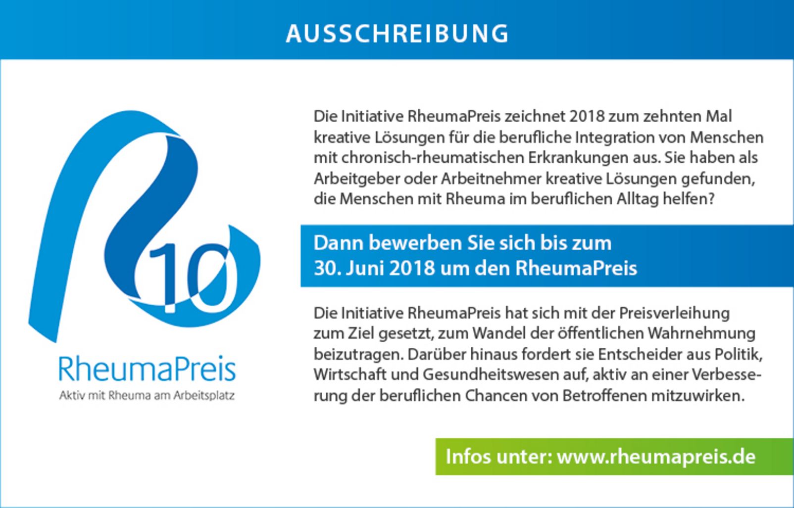 Die Initiative RheumaPreis wurde im Jahr 2009 gegründet. In diesem Jahr zeichnet sie schon zum zehnten Mal Arbeitnehmer und ihre Arbeitgeber aus, die gemeinsam Lösungen für eine Berufstätigkeit mit Rheuma gefunden haben. Eine unabhängige Jury aus Medizinern, Patientenvertretern, Experten für die berufliche Eingliederung Erkrankter und Arbeitsmedizinern prüft und bewertet die eingehenden Bewerbungen.
