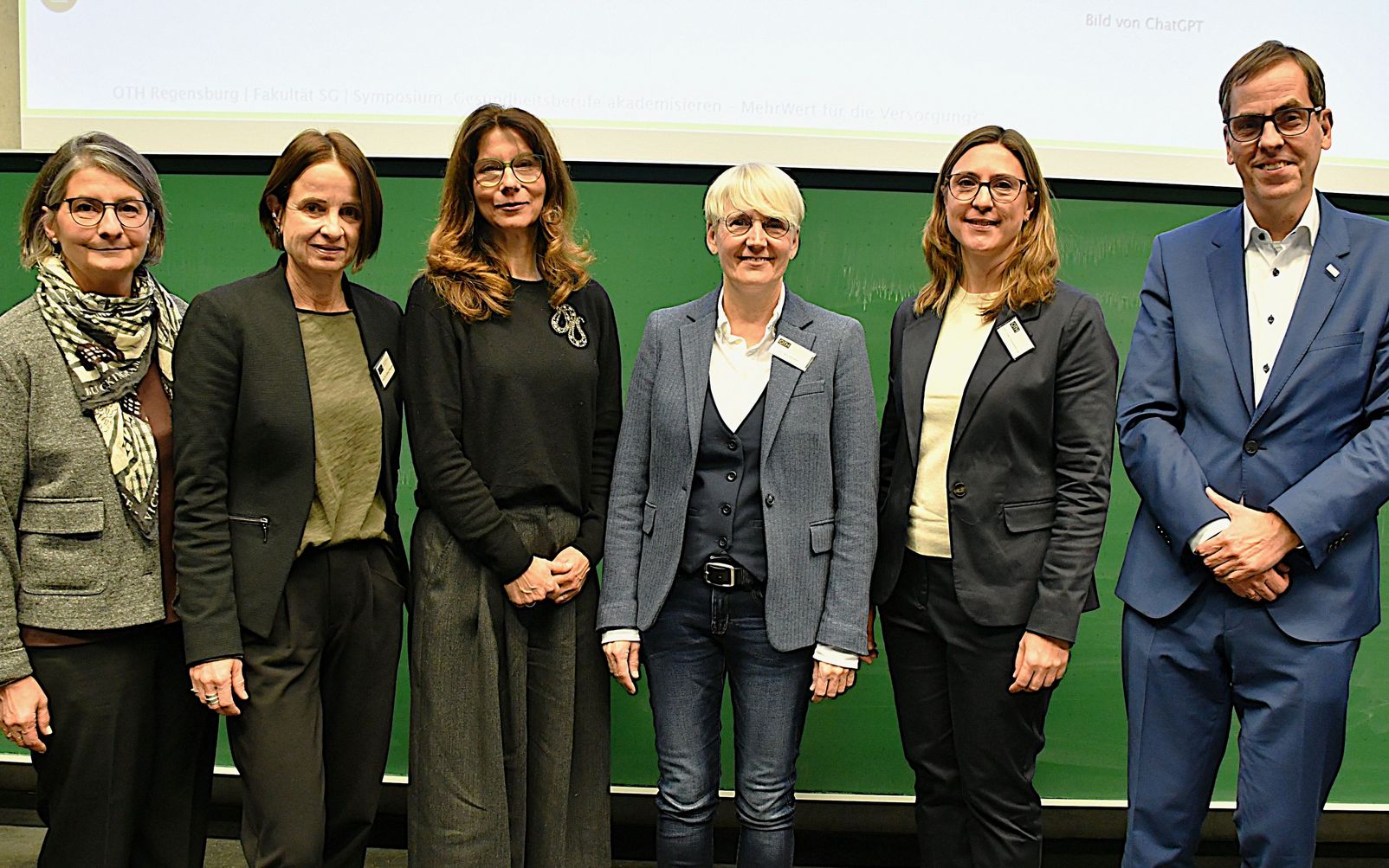 Bild 1: Die Teilnehmenden des Symposiums waren sich einig: Die Akademisierung der Gesundheitsberufe ist ein wichtiger Schritt für eine qualitativ hochwertige Gesundheitsversorgung. Von links: Kerstin Hartmann, Prof. Dr. Andrea Pfingsten, Prof. Dr. Uta Gaidys, Prof. Dr. Norina , Prof. Dr. Christiane Wissing und Prof. Dr. Ralph Schneider Foto: OTH Regensburg/Simone Grebler