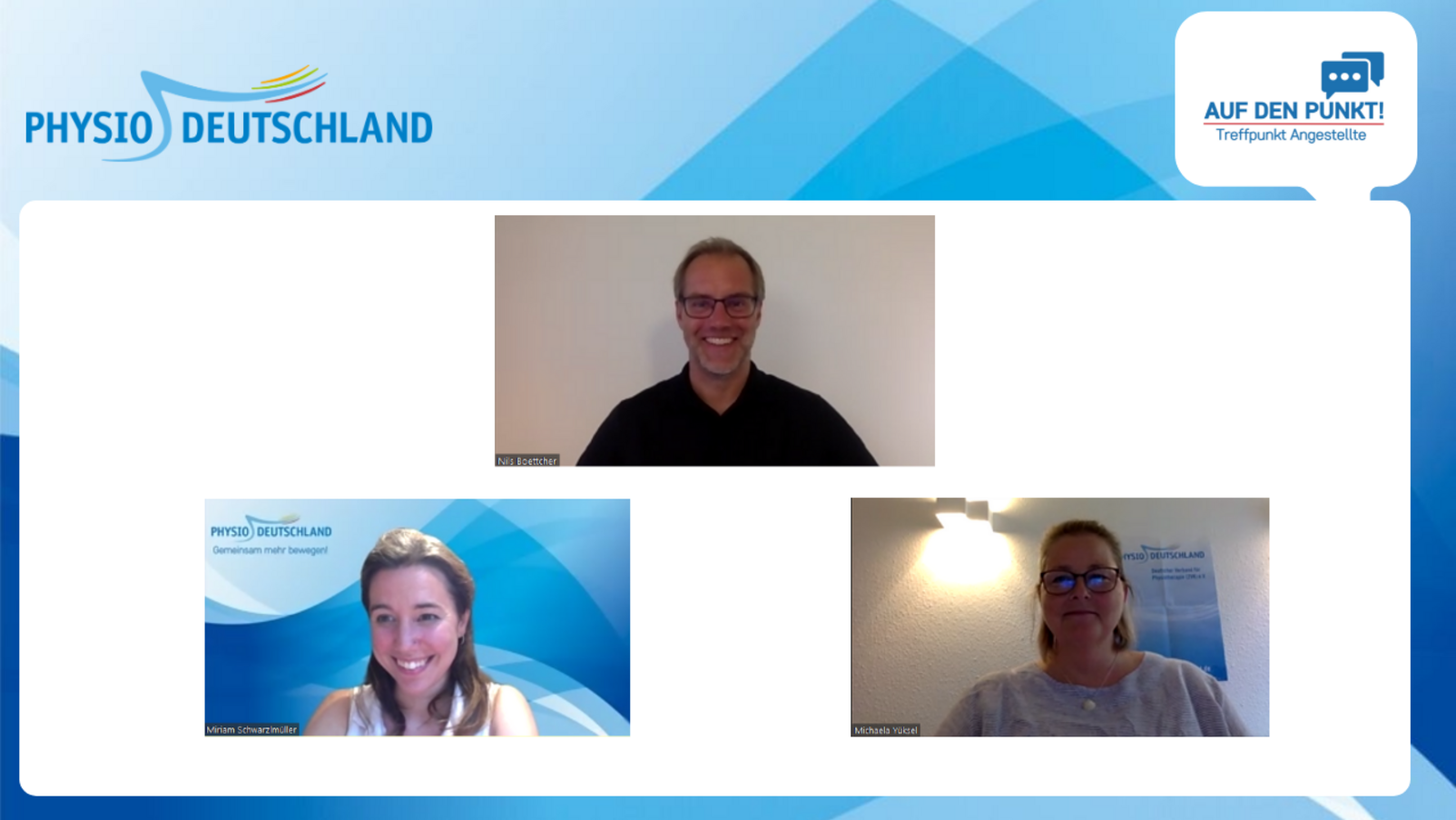 In diesem Webinar bekamen die Teilnehmenden einen Einblick, wie passende Coaching-Techniken die physiotherapeutische Behandlung sinnvoll ergänzen können. Nils Boettcher ist Physiotherapeut und Coach. Moderiert wurde die Veranstaltung von Miriam Schwarzlmüller, Vorstand im Landesverband Bayern und Michaela Yüksel, Beiratsmitglied im Landesverband Hessen/Rheinland-Pfalz/Saarland.